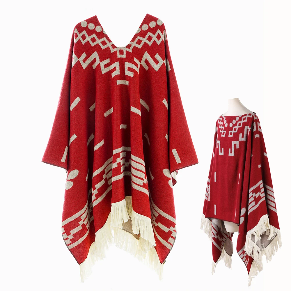 On a crisp autumn evening by the campfire, you slip into a vibrant red classic poncho that feels like a warm embrace against the chill. Flickering embers reflect on the geometric pattern, while the long tassels sway as you move. The Poncho Cowboy style adds a touch of western flair, perfect for festival nights or countryside strolls.