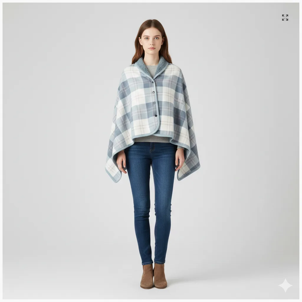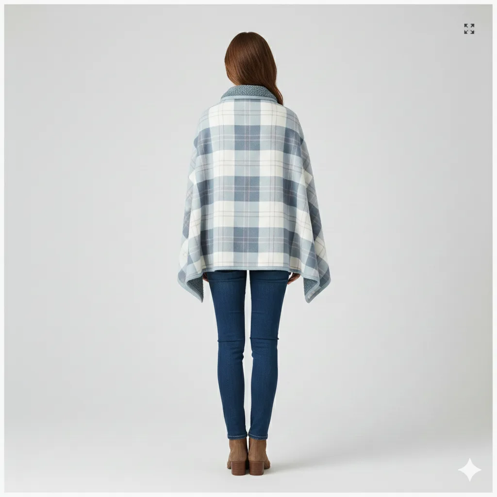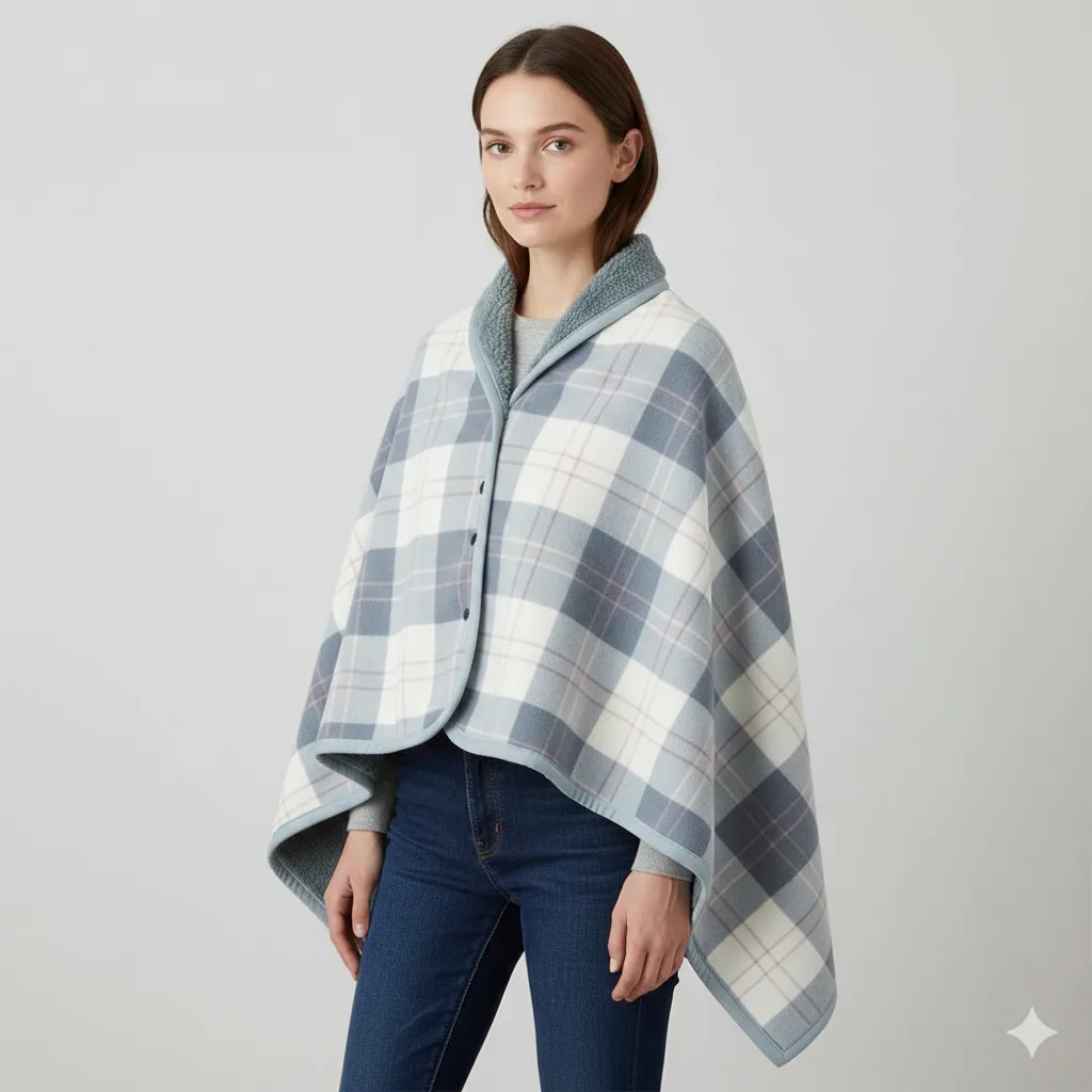 Made from thickened double-layer fabric, this poncho combines a classic plaid outer with a soft inner lining.
